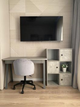 В квартире выделена отдельная зона для работы - просторный письменный стол с креслом и быстрым интернетом. А для отдыха - удобный диван с независимым пружинным блоком, лёжа на котором, можно с комфортом смотреть телевизор 55 дюймов с QLED-матрицей.