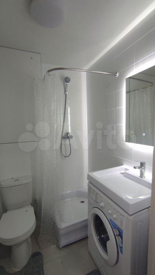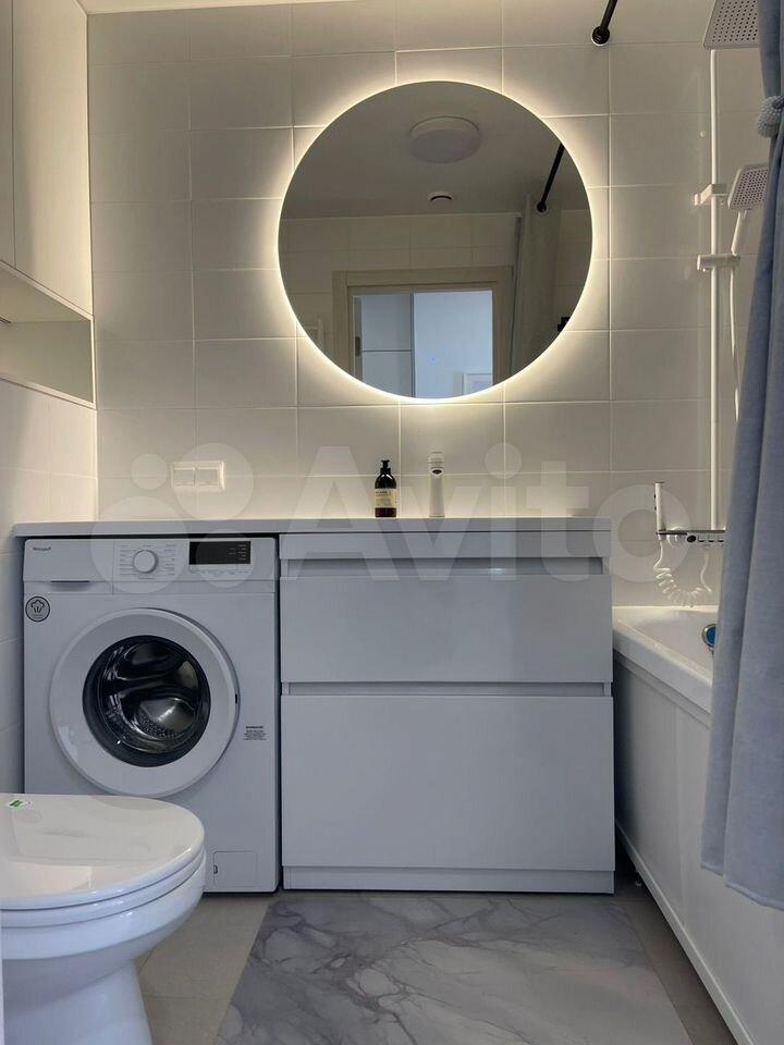 • современный санузел с душевой кабиной, стиральной машиной и шкафчиком;