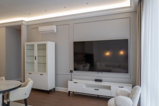 Вся квартира оснащена системой кондиционирования (4 внутренних блока+1 внешний), системой пожарной безопасности и системой от протечек воды. Санузлы оборудованы премиальной сантехникой Villеrоy & Восh — эталон качества и эстетики. Огромные панорамные окна со специальным напылением от солнца, подоконники из искусственного камня, качественные радиаторы с регулировкой. Тёплые полы в санузлах, прихожей и на кухне. Интегрирована система голосовым управлением шторами блэк-аут.