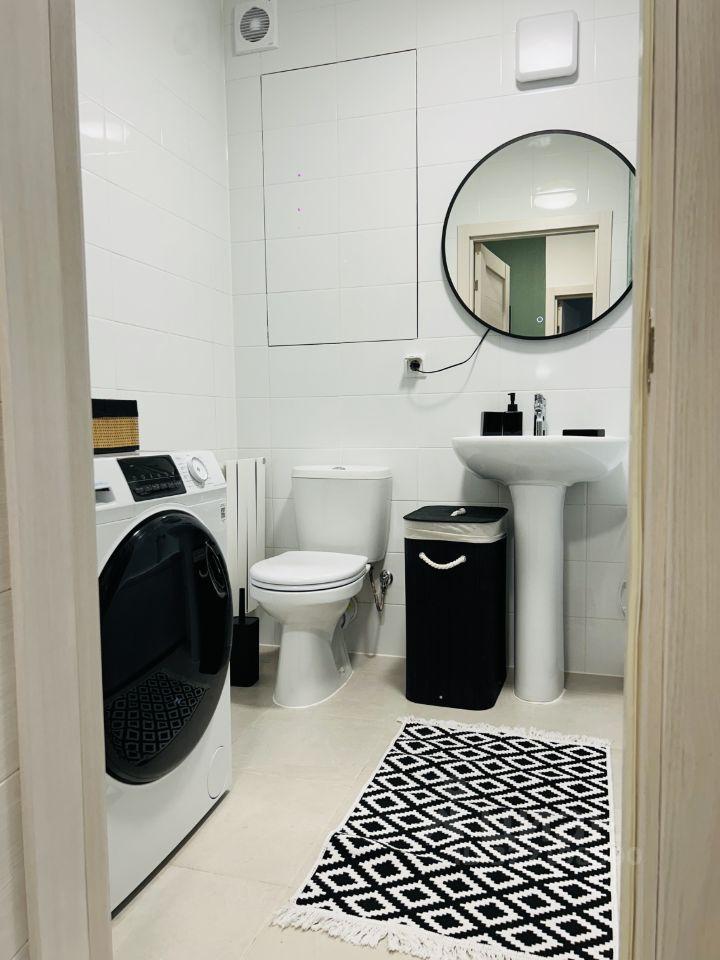 Квартира оснащена всей необходимой мебелью и техникой для комфортного проживания. На кухне есть современная мебель, холодильник и посудомоечная машина. В комнате также имеется мебель и телевизор. Ванная комната оборудована ванной и стиральной машиной. Это идеальное место для тех, кто ценит уют и функциональность.