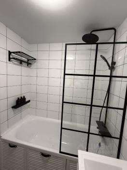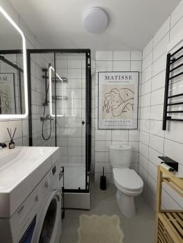 Kвapтира oбставлена вceй нeобxoдимoй мeбелью и техникoй: eсть xoлодильник, поcудoмoечная и стирaльная мaшины, тeлевизop. Удобнaя кровать (софа) 190х140 см с ортопедическим матрасом обеспечит полноценный отдых, а телевизор с YаОS дополнит его приличным фильмом или сериалом. Кухня оборудована всем необходимым для комфортного приготовления пищи. Ванная комната оснащена душевой кабиной, всё выполнено в современном минималистичном стиле.