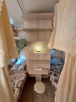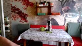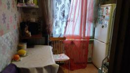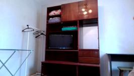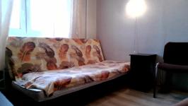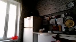 Комната небольшая без балкона. Два шкафа, две тумбочки, кровать. Санузел раздельный. Кухня просторная, электрическая плита, но, к сожалению, духовка не работает. Микроволновка, чайник, стиральная машинка, гладильная доска и утюг в наличае.