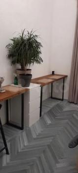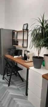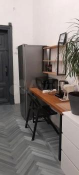 Двухкомнатная квартира с кухней-гостиной. В квартире два этажа, два санузла. Комнаты изолированы, в Вашей комнате двуспальная кровать, мебель для хранения (2 небольших платяных шкафа), торшер,ночник, чайник,мини-холодильник, гладильная доска, утюг настенные часы, декоративные зеркала.