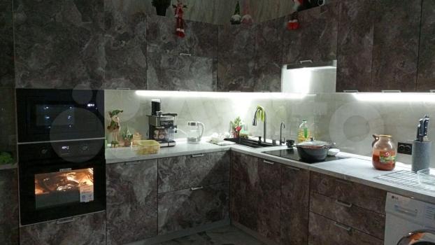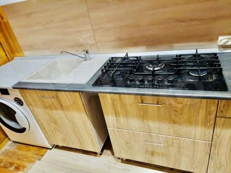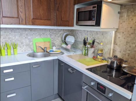 В кухне необходимая техника(плита, духовка, микроволновая печь, посудомойка, холодильник).