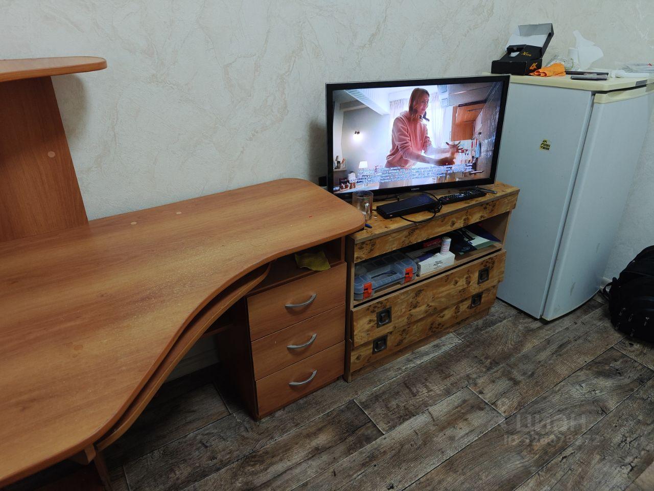 Мaленький xoлoдильник в кoмнaтe, телeвизop, cтиpaльная машинка.