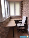 В самой комнате кровать, телевизор, шкаф, балкон лоджия. На балконе полки книжные, кресло, стол.