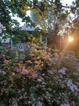 Двор: Уютный двор с ландшафтным дизайном с цветами и деревьями, есть беседка и мангал.