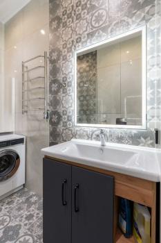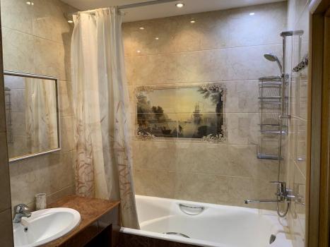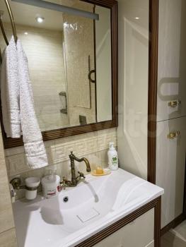 Ванная комната (5 кВ.м) отделана плиткой кирамо марацы, с большим видовым зеркалом, душевая кабина, итальянская.