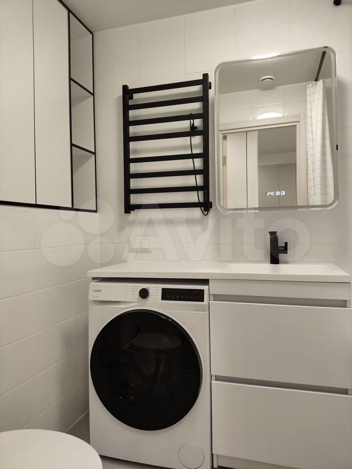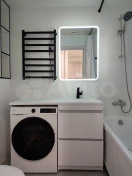 Ванная комната: стиральная машина, фен, необходимые аксессуары.