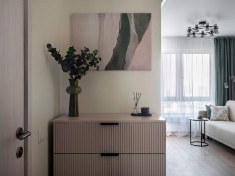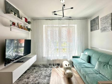 Сдаётся в аренду однокомнатная квартира. Общая площадь квартиры — 40 кв. м, из них жилая — 20 кв. м, кухня — 9.7 кв. м. Квартира расположена на 9-м этаже 13-этажного монолитного дома, построенного в 2017 году. Высокие потолки (3.1 метра) и окна, выходящие на улицу, делают помещение светлым и просторным. До метро Тушинская — всего 7 минут пешком.