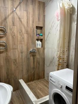 Диван раскладной, обеденный стол с 2умя стульчиками, чайник, электро плита, стиралка, душевой уголок.
