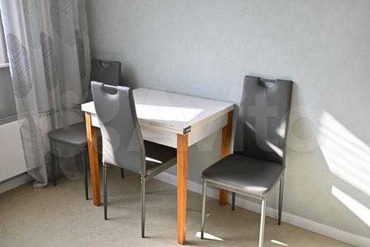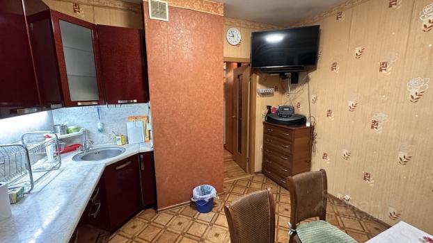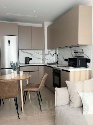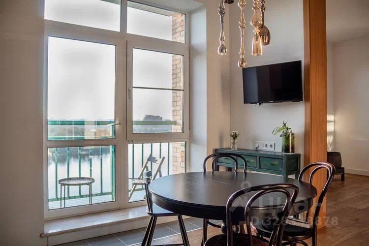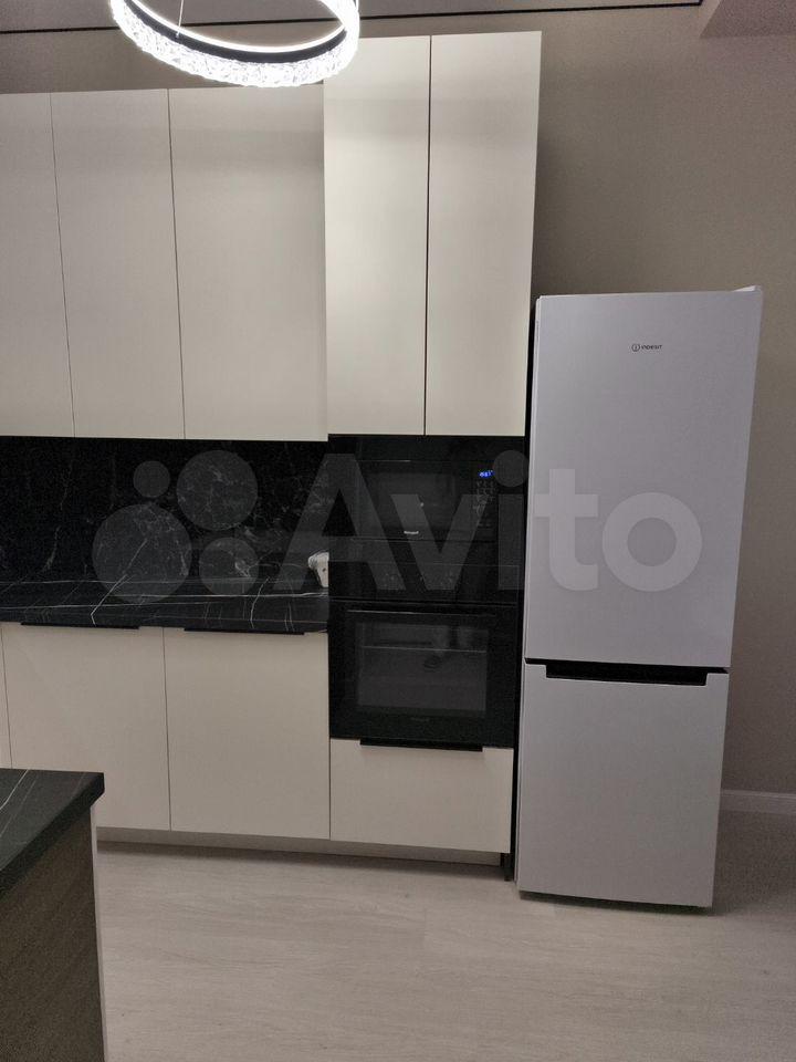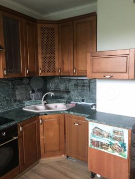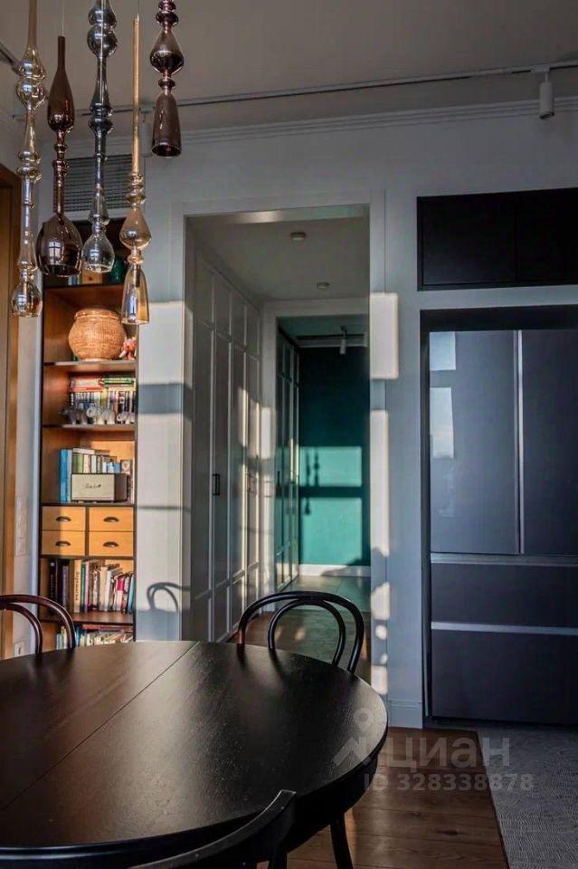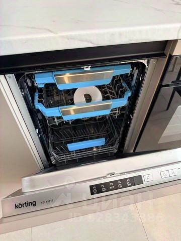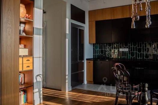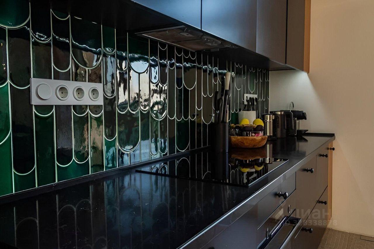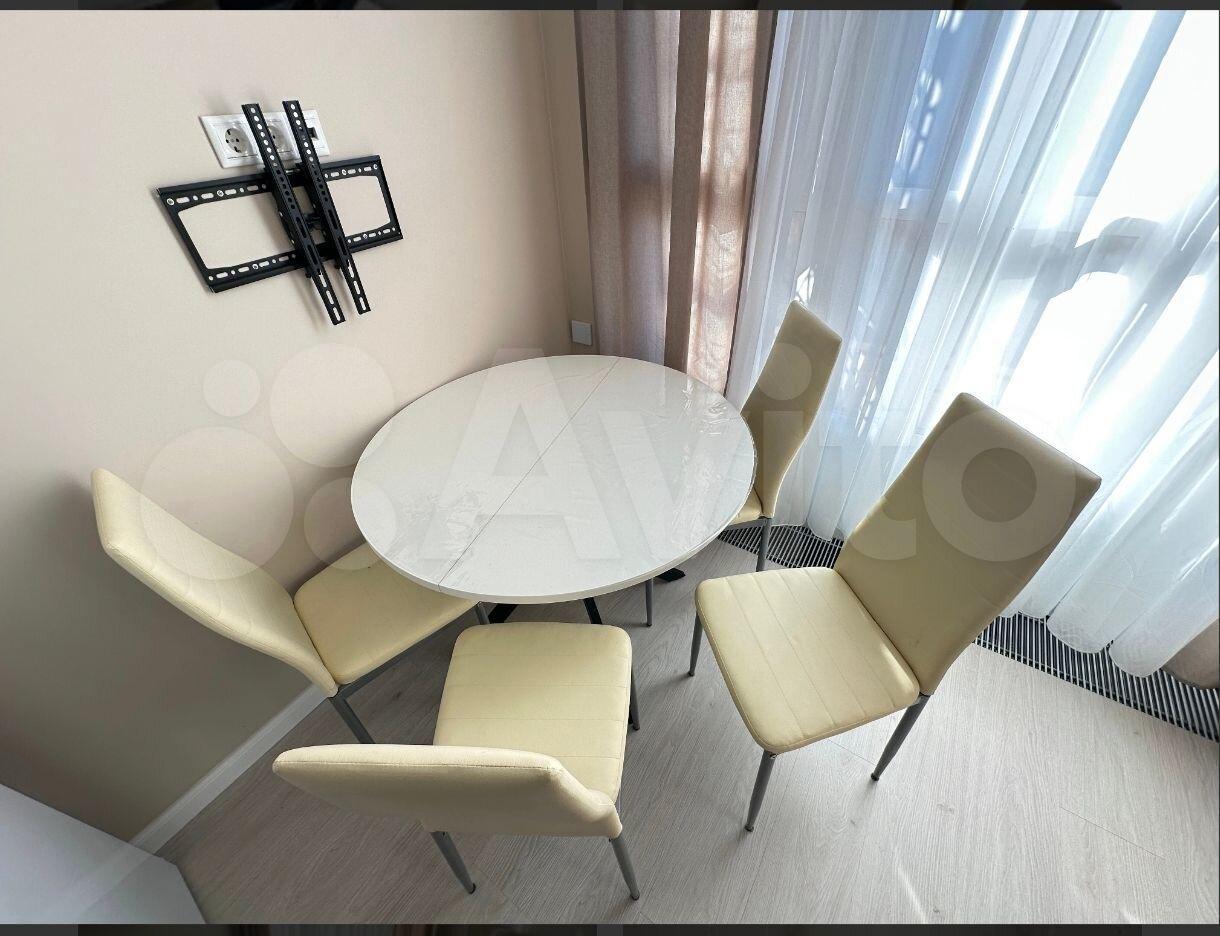 В кухне-столовой посудомоечная машина, холодильник (двухдверный), варочная панель, духовой шкаф. Плитка на кухне ручной работы. Тёплый пол. Установлен фильтр для воды и измельчитель для пищевых отходов. Круглый обеденный стол легко вместит 4-5 человек и может быть трансформирован в овальный. На стене расположен телевизор Sony.