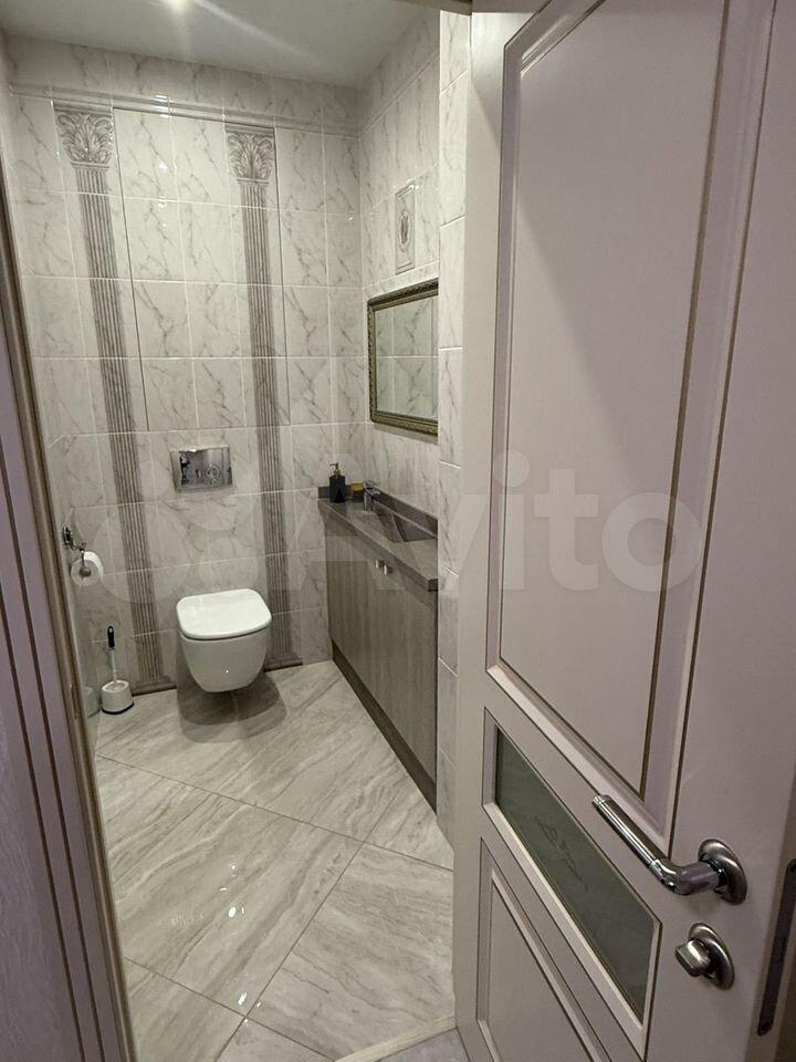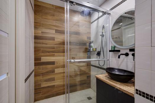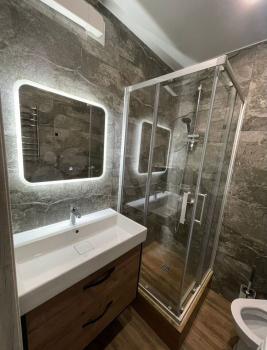 Санузел совмещенный, выполнен в стильном мраморном дизайне с душевой кабиной.