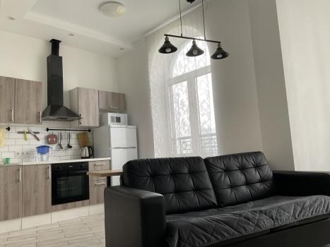 Сдаётся светлая однокомнатная/Двушка с дизайнерским ремонтом. разделена стеклянной перегородкой! Спальня изолирована, и кухня -гостинная!