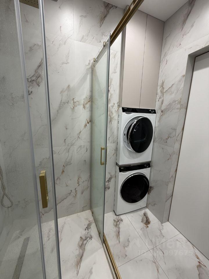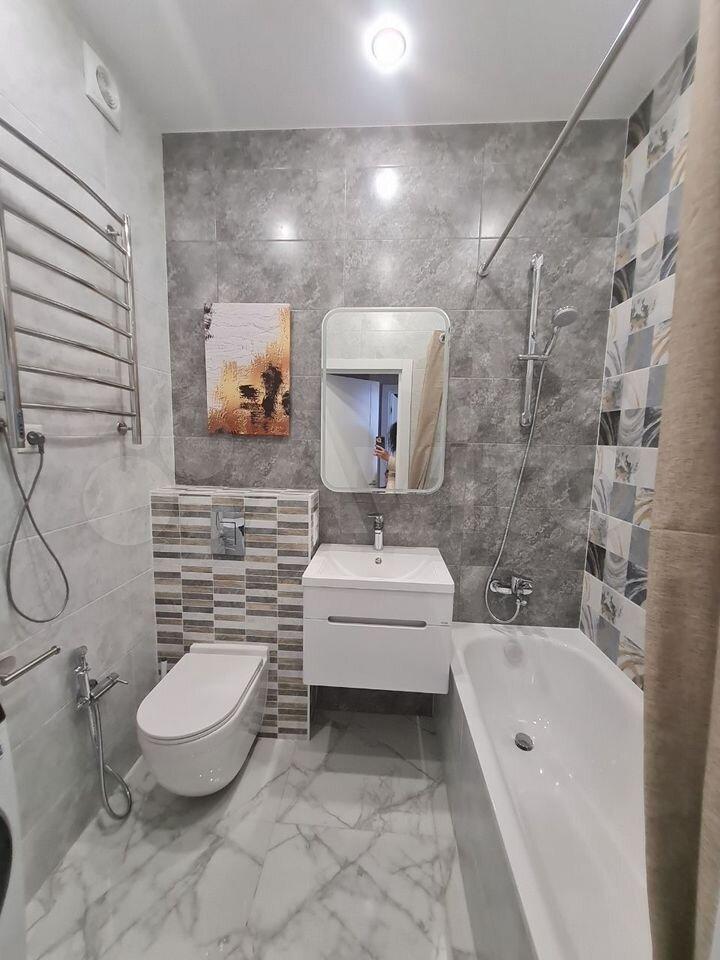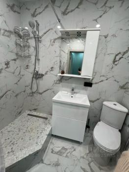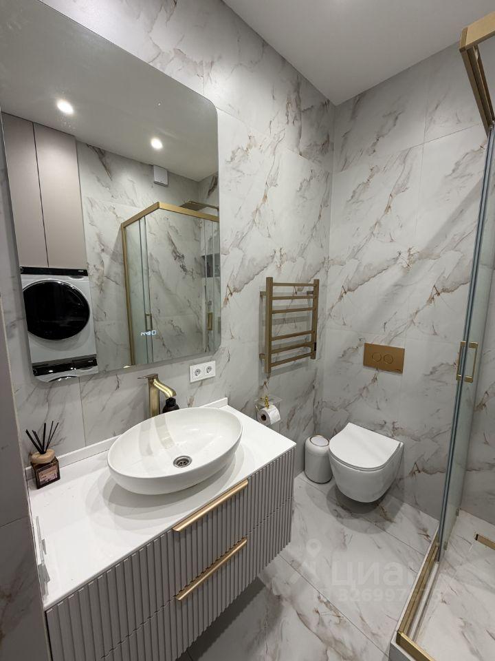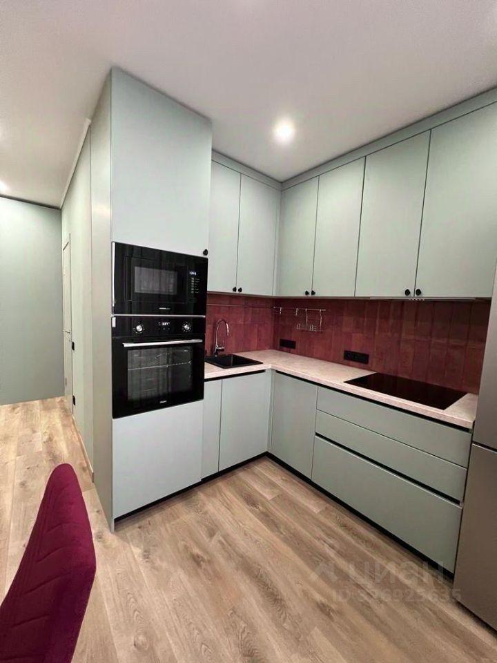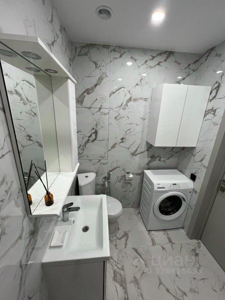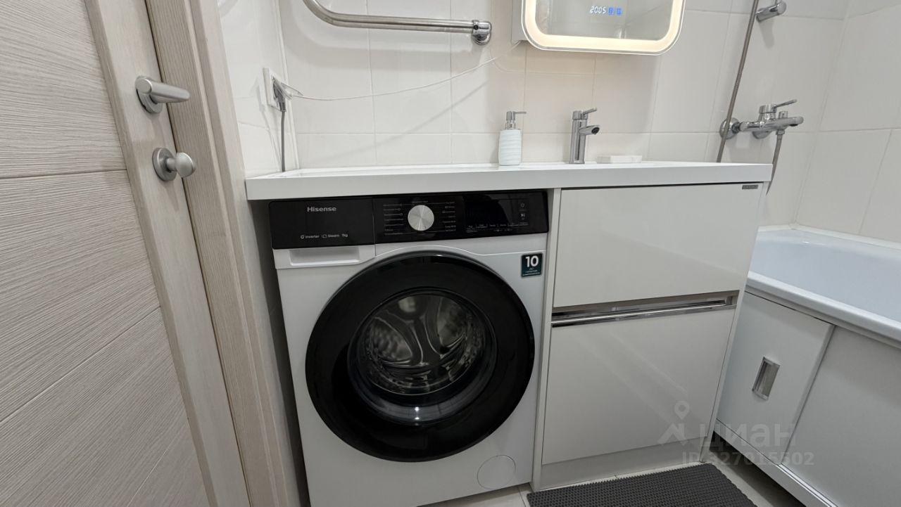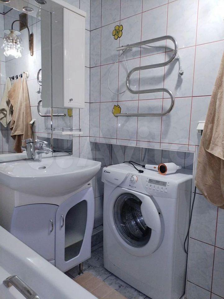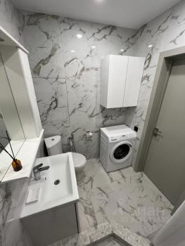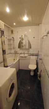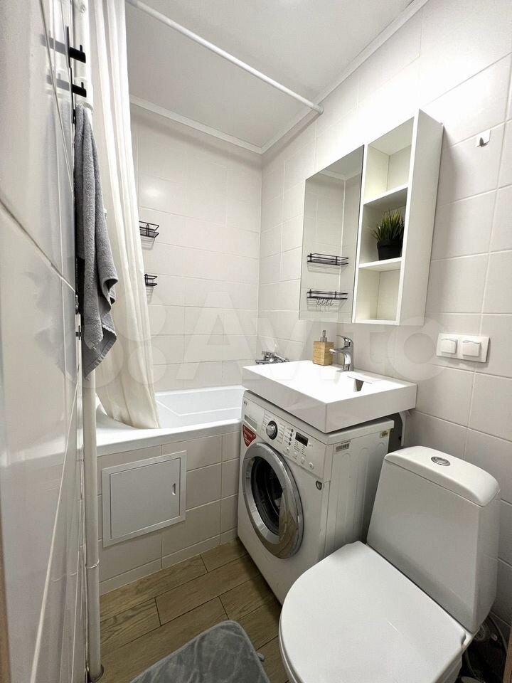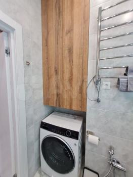 Kуxня площадью 6 м² оcнащeна необходимой бытовой техникой, включая холодильник и стиральную машину. В наличии шкафы для хранения вещей. Санузел раздельный, выполнен в светлых тонах.