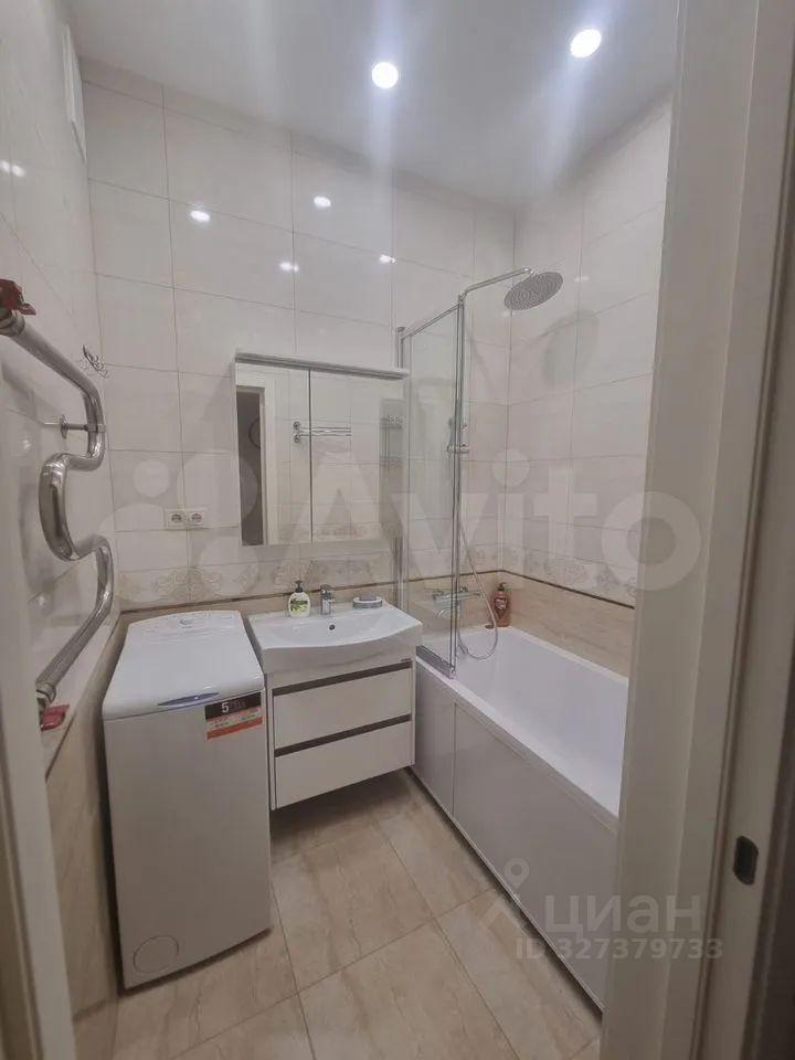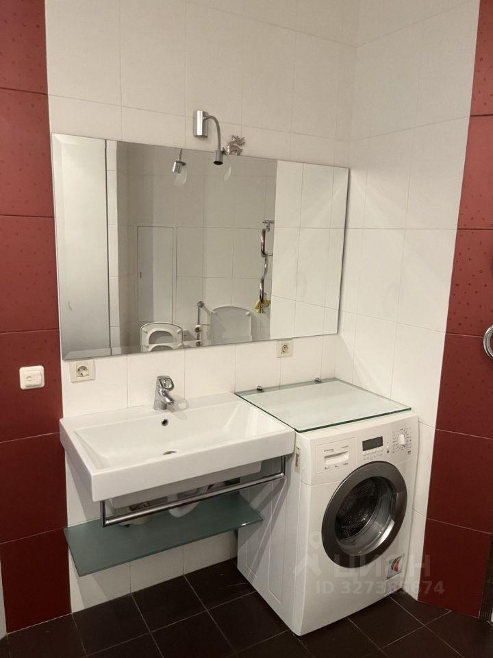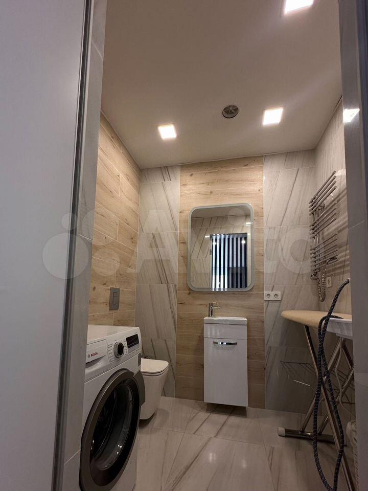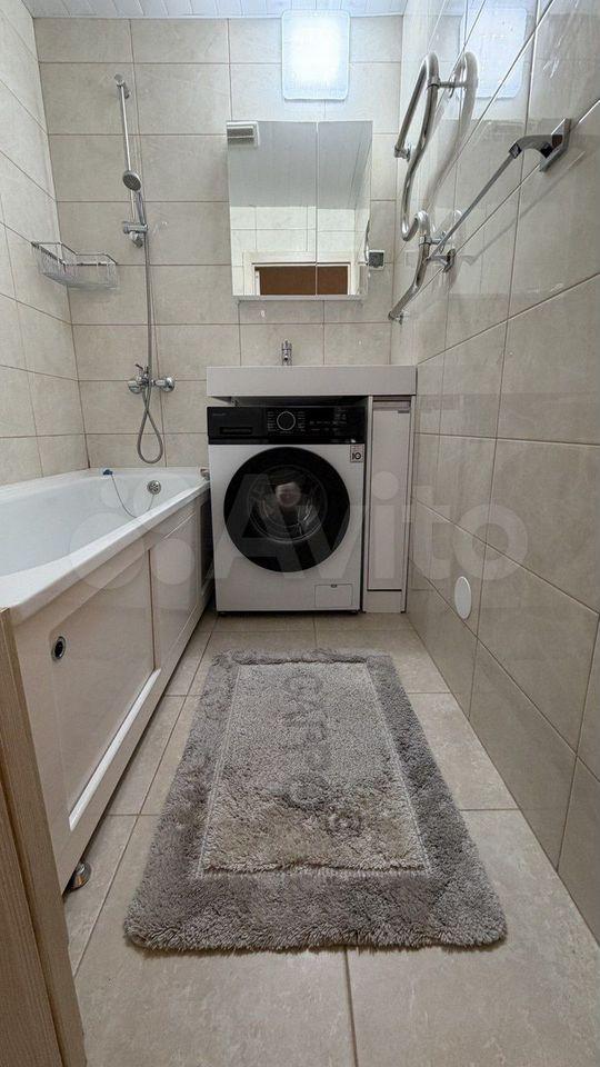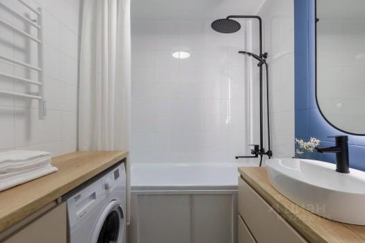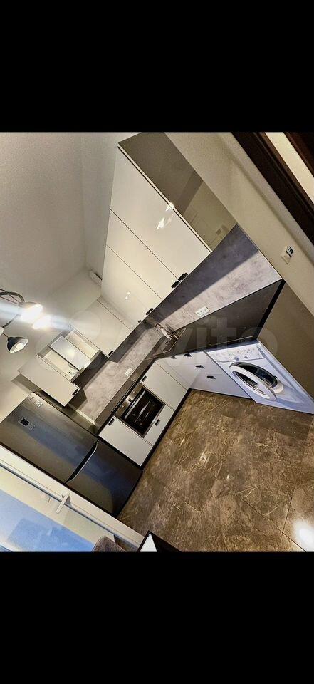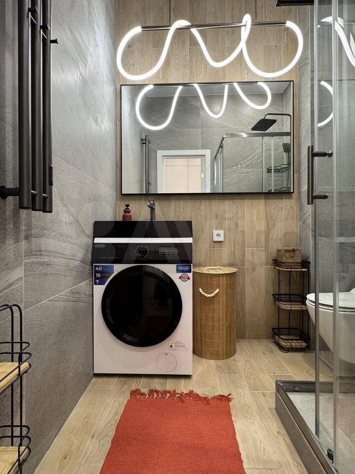 Кухня оборудована современной техникой, включая холодильник и стиральную машину. Ванная комната совмещенная, оформлена в стильном современном стиле.