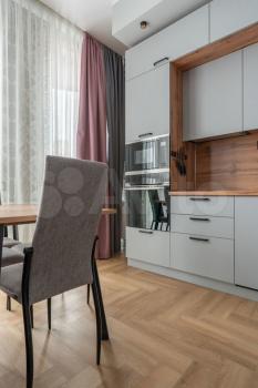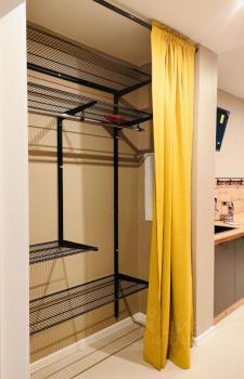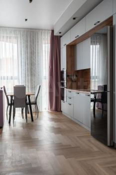 Одна комната изолированная (15 кВ.м)(спальная комната), кухня гостиная (20 кВ.м), гардеробная (3 кВ.м). Панорамные окна.