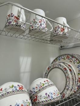Набор кухонной посуды, чашки, бокалы, столовые приборы, вешалки для одежды.