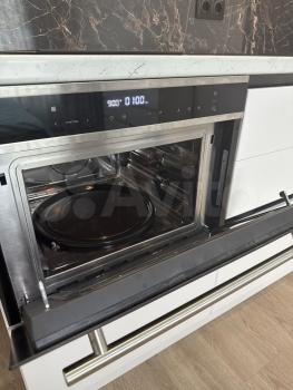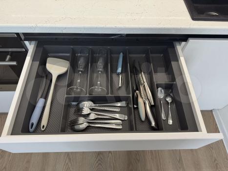 В кухне есть все необходимое: большая посудомоечная машина, духовка с функцией микроволновой печи, варочная панель, большой холодильник, чайник, установлена система фильтрации воды и дополнительный питьевой кран, вытяжка, кухонный фартук изготовлен из керамогранита, большая зона хранения посуды и продуктов.