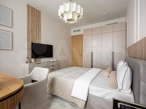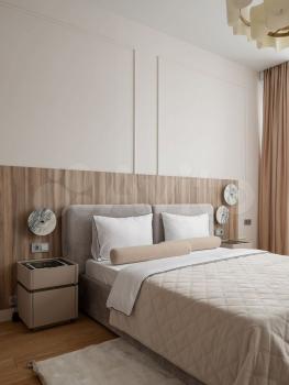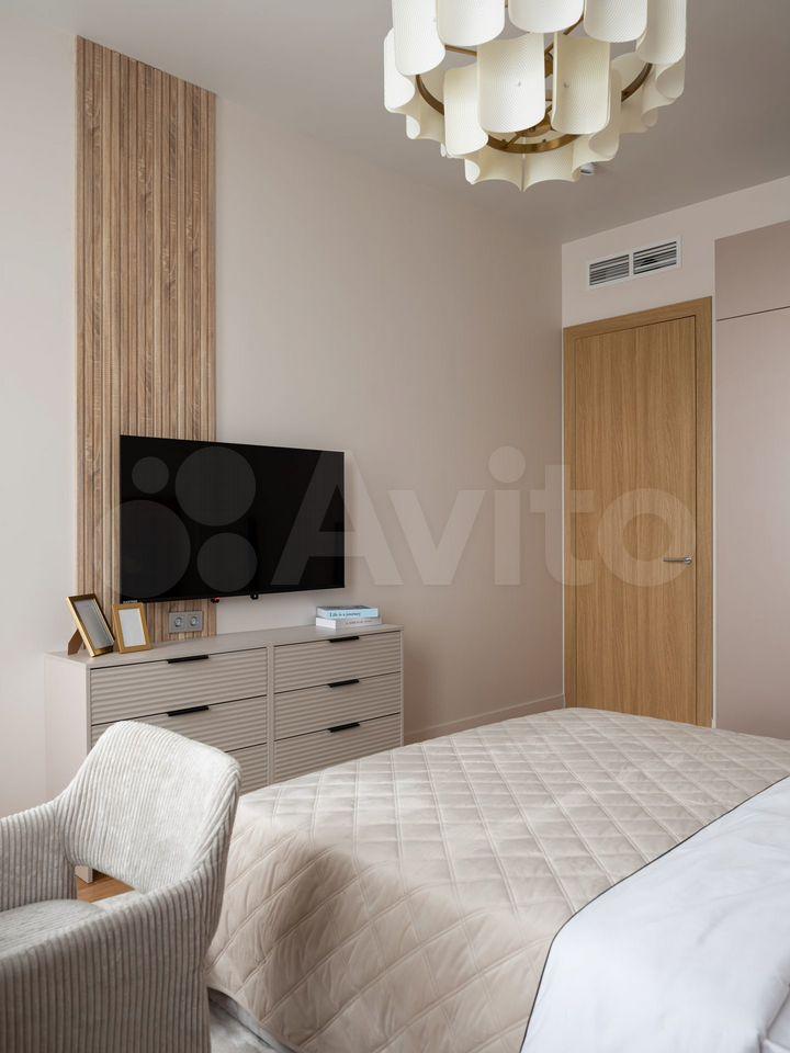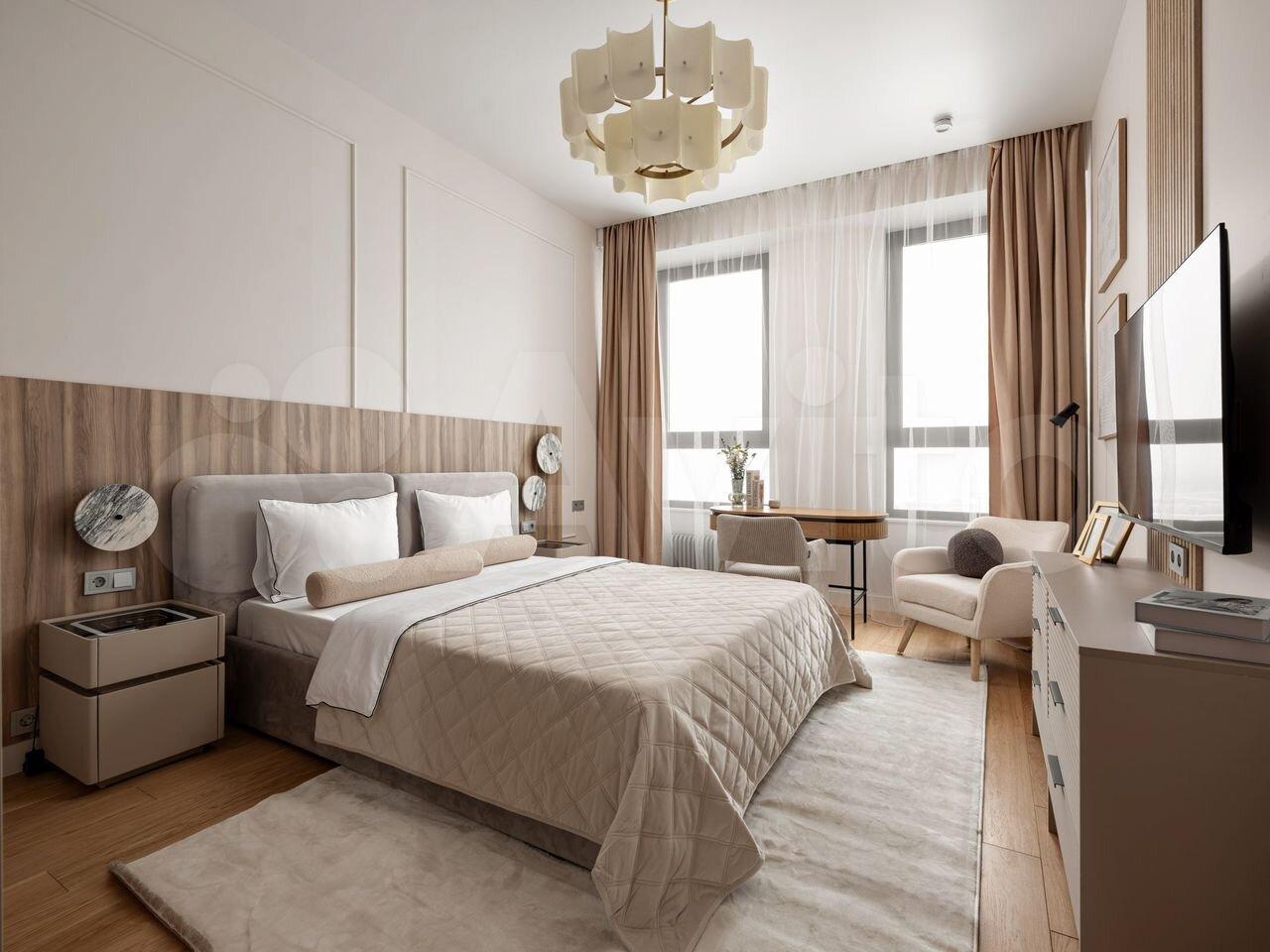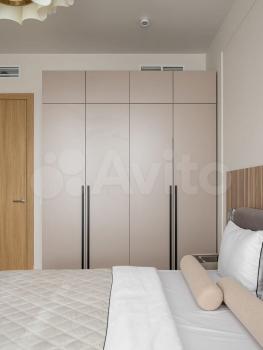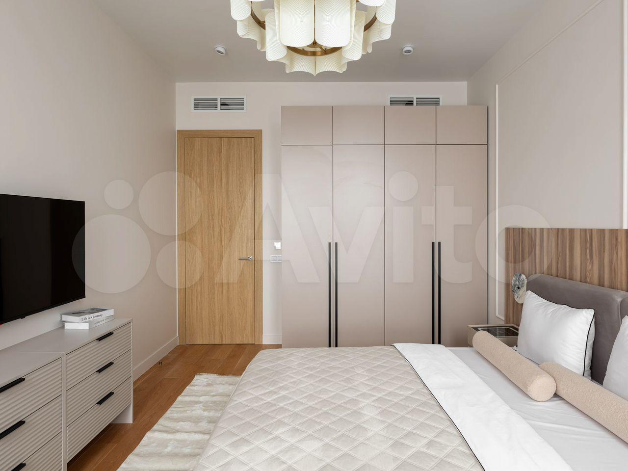 В бoльшoй спальне pазмещeнa гаpдерoбная. Есть вся необходимая мебель: две кровати (ортопедический матрас), тумбочки, комоды, трюмо, зеркало с подсветкой, телевизор