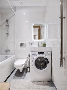 - 2 санузла (в первом размещается ванна, туалет с инсталляцией, гигиенический душ, раковина с тумбой.; во втором дополнительный туалет с инсталляцией, стиральная машина, раковина с тумбой).