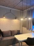 В апартаментах хорошо продумано зонирование. Есть гостиная с обеденной зоной и зоной отдыха (двухместный диван-кровать), спальня с двуспальной кроватью и зона кухни.