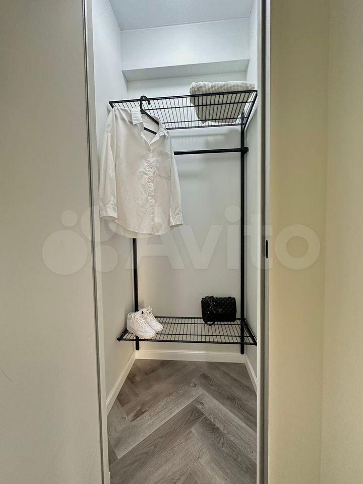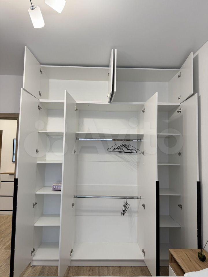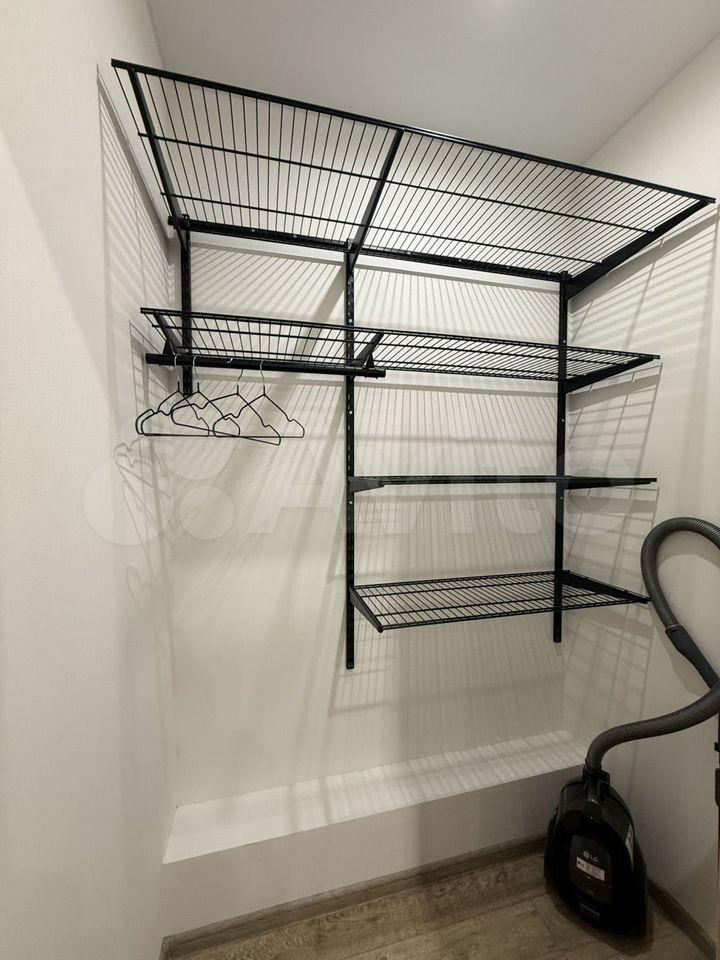 Продуманное хранение – отдельный гардероб с гибкой системой хранения (можно переставлять полки по желанию), комод, большой шкаф в прихожей с зеркалами и открытая вешалка, пространство под кроватью и диваном, высокие вместительные шкафы кухни, тв-консоль, стеллаж.