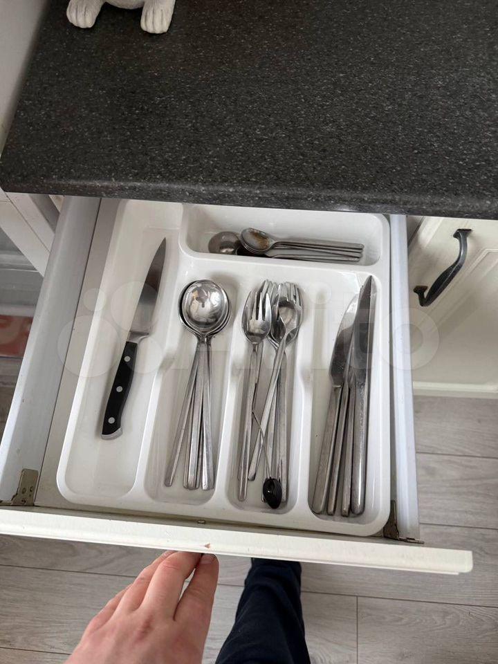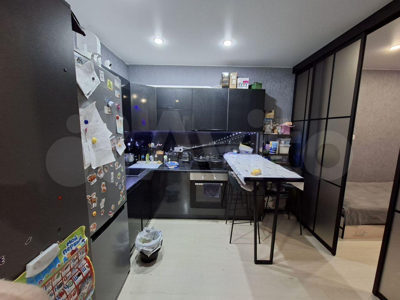 Полностью оборудованная кухня со встроенной техникой: холодильник, посудомоечная машина, микроволновка, духовка.