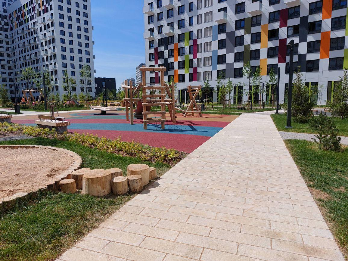 Новый двор с двумя детскими комплексами и спортивной площадкой.