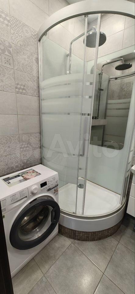 Ванная комната с душевой кабиной, раковиной и стиральной машиной.