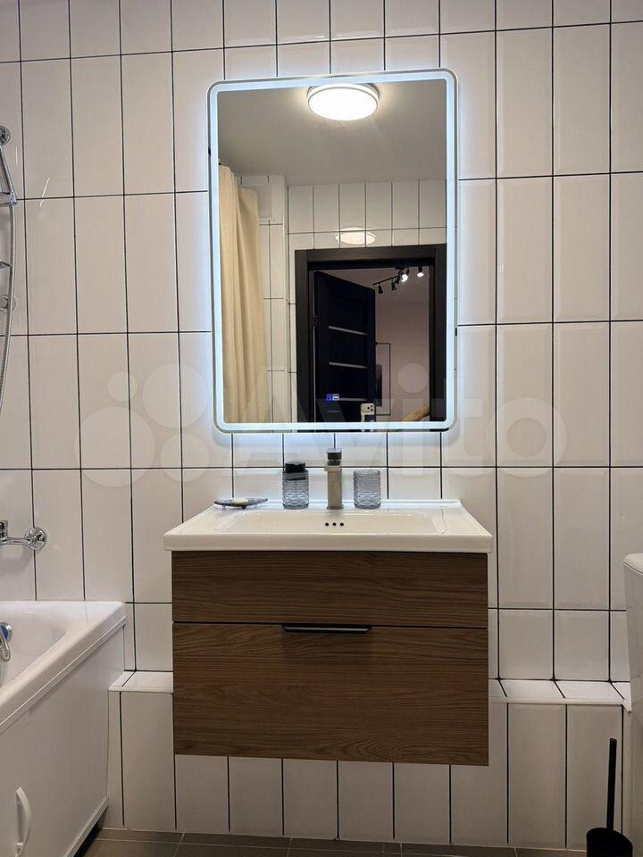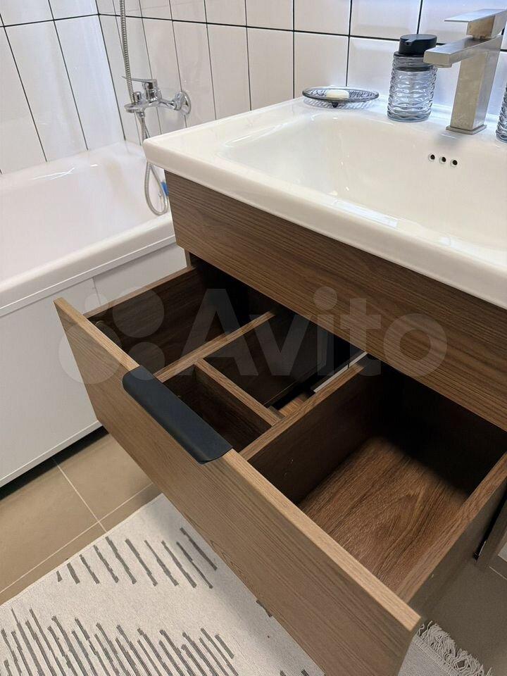 На фото еще нет, но все это будет к 27 апреля: Телевизор 55 дюймов, тумбочка прикроватная, шкаф-пенал в ванной, крючки для полотенец.