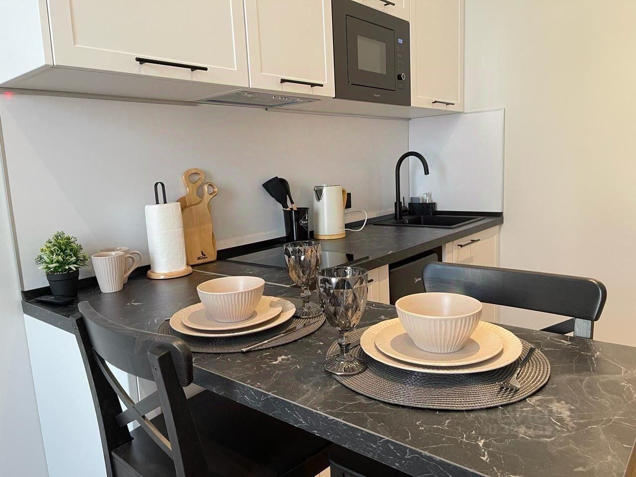 Квартира полностью укомплектована современной мебелью и техникой: кухонный гарнитур, удобная двуспальная кровать и шкафы для хранения. В наличии , микроволновка, стиральная и посудомоечная машина, варочная панель и духовой шкаф, фильтр для питьевой воды на кухне, пылесос.