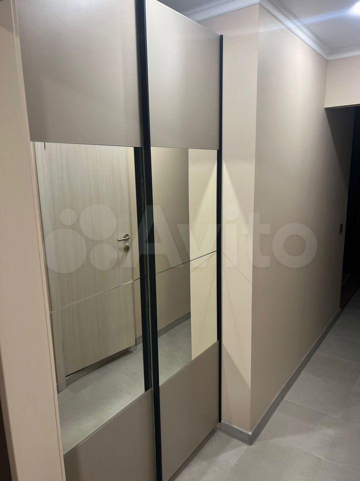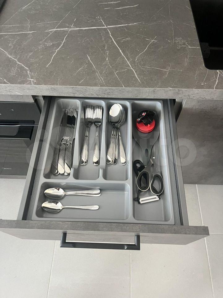В кухне-гостиной установлена мощная сплит-система, современный кухонный гарнитур (2,85 х 1,95 – индивидуальный проект), со встроенной техникой (посудомоечная машина, индукционная плита, духовой шкаф, СВЧ-печь, вытяжка с подсветкой, холодильник 2-камерный, чайник). Раскладывающийся диван с местом хранения, комод, рабочее место с подсветкой и офисным креслом, обеденный стол с покрытием из закаленного стекла и удобными стульями, смарт-телевизор диагональю 40 дюймов. Прихожая оборудована входной группой из отдельной вешалки для верхней одежды с антресолью, полкой-обувницей и высоким шкафом для одежды и хранения.