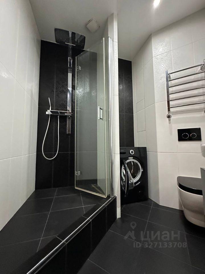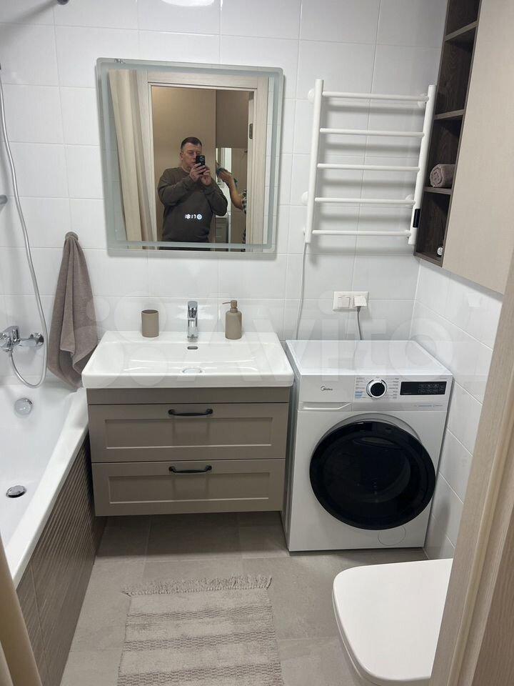 Ванная комната облицована плиткой, новая сантехника, стиральная машина, встроенный шкаф для хранения, зеркало с подсветкой.