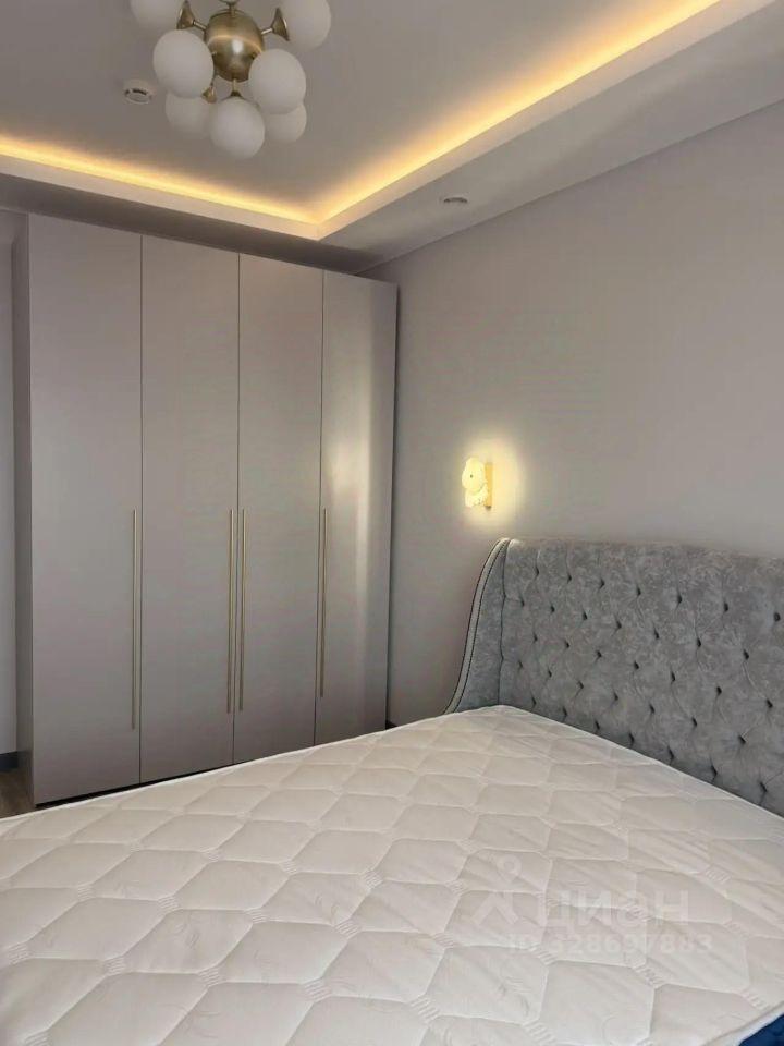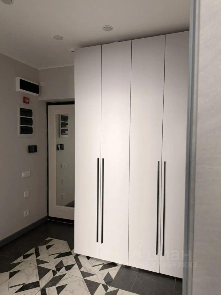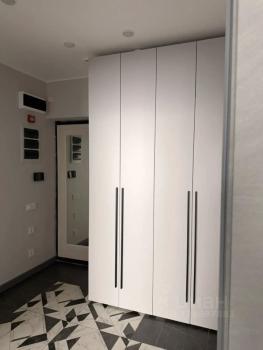 В гостиной установлен вместительный шкаф-купе и телевизор. Из окон открывается вид на городские пейзажи. В квартире есть гардеробная, что добавляет удобства для хранения вещей.