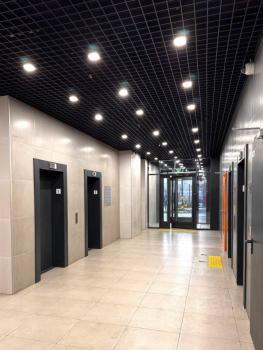 Современный подъезд с четырьмя лифтами и двумя входами.