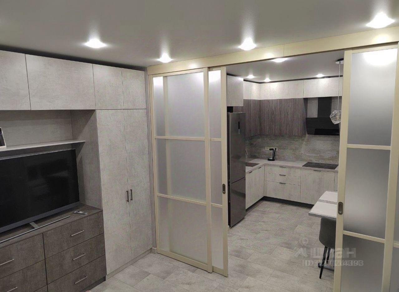 • Кухня-гостиная 25 м² разделена стеклянной перегородкой: кухня и гостиная/кабинет. Кухня: вся новая встроенная техника (ПММ, духовка, плита, СВЧ, холодильник) и мебель Стильные кухни; зона гостиной: диван-книжка, кондиционер, рабочий стол, вместительный шкаф вдоль стены с ТВ зоной, небольшой шкаф у дивана.