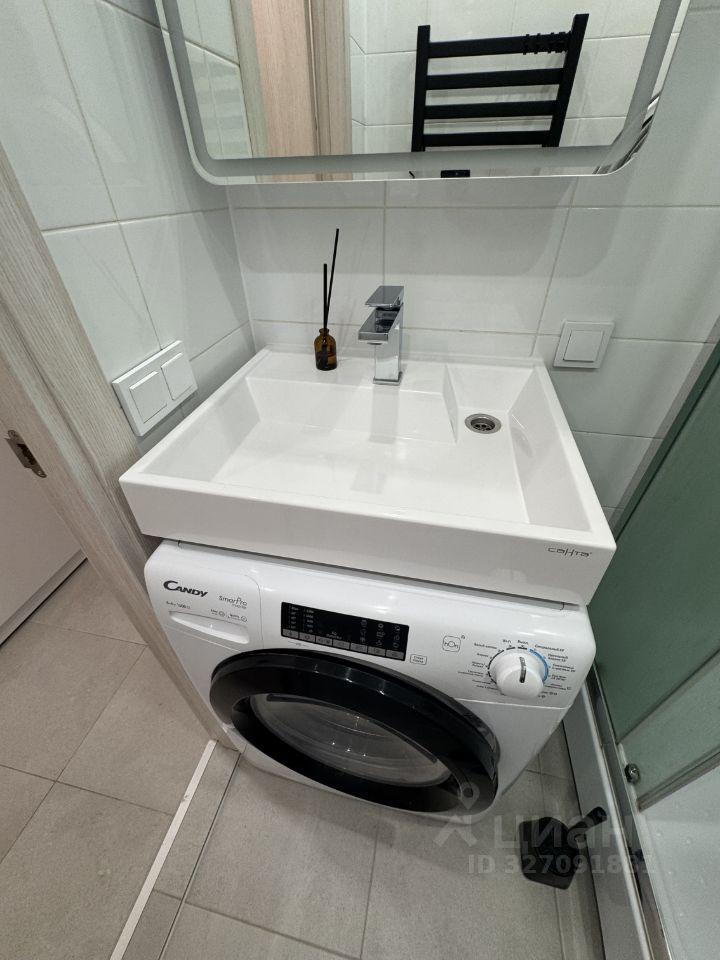 Ванная комната: чистая, светлая, с полной комплектацией (стиральная машина, раковина, зеркало, шкафчик, корзина для белья, полотенца и коврик).