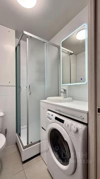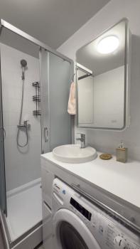В санузле удобная раковина с крылом и ящиками для белья и принадлежностей, шкаф с подсветкой и полками, стиральная машинка с сушкой , электрический полотенцесушитель.