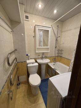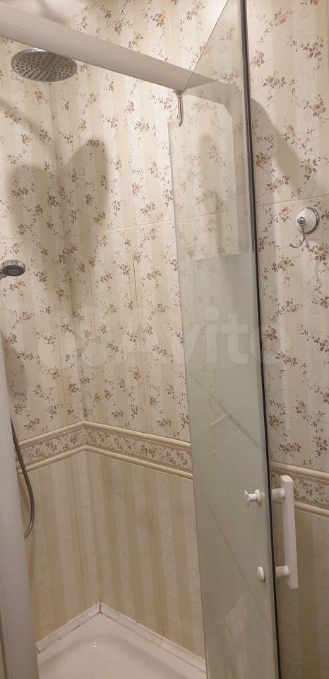 Совмещенный санузел оборудован душевой кабиной, сантехникой и стиральной машиной