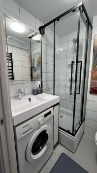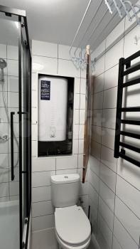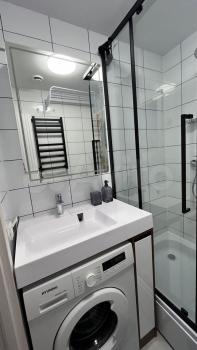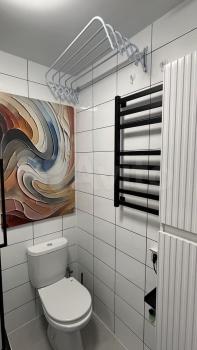 Санузел совмещенный, оснащен современной сантехникой и абсолютно новой стиральной машиной Bosch с функцией пара. Водонагреватель + гигиенический душ. Лоджия добавляет дополнительное пространство для отдыха.