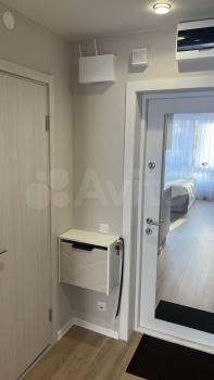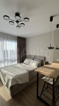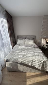 В квартире есть все необходимое для комфортного проживания: современная мебель в комнате и на кухне, а также полный комплект техники — кондиционер, холодильник, посудомоечная и стиральная машины, телевизор. Санузел совмещенный, оборудован ванной. Панорамные окна выходят на улицу, что обеспечивает естественное освещение и виды на город.