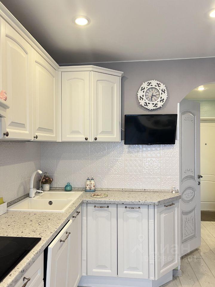 Светлая кухня площадью 8,6 м² оборудована холодильником, индукционной плитой и современной мебелью. Из окон открывается приятный вид на зеленый двор с детской площадкой и спортивной зоной.