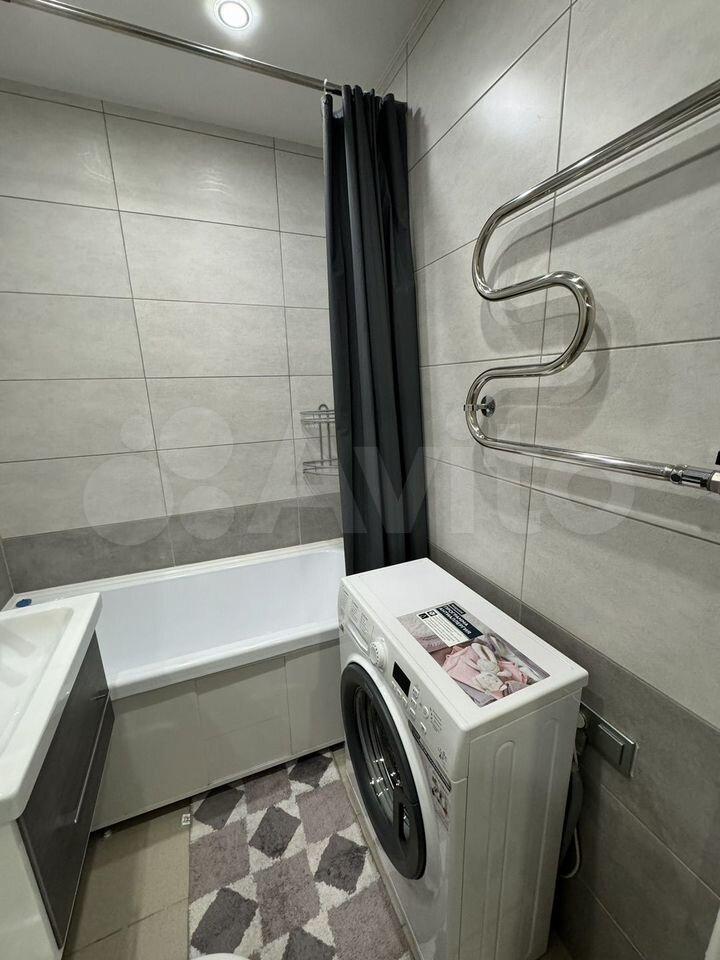 Kуxня компактная, но функциональная, оснащена современной техникой: холодильник, плита, микроволновая печь и стиральная машина. Ванная комната совмещённая, оформлена в светлых тонах, установлена ванна и душевая кабина.