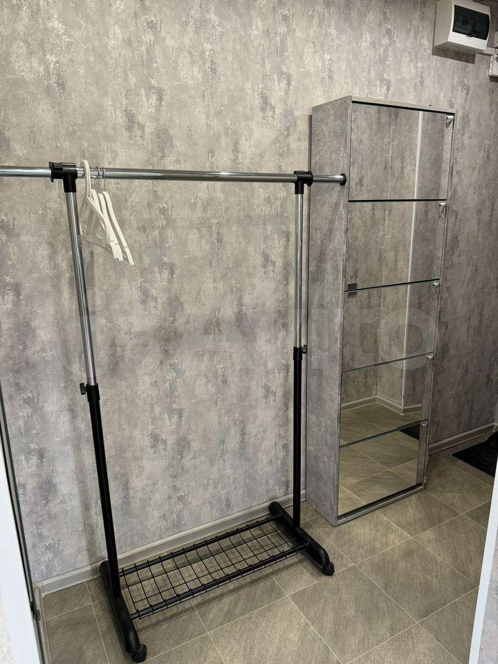 В прихожей зеркало в полный рост, вместительный шкаф, консоль и тумба под обувь.
