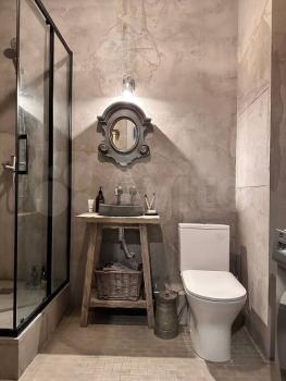 Просторный совмещенный с/у с французской ванной, подвесным черным унитазом, стиральной машиной автомат и сантехникой по последнему слову стиля!
