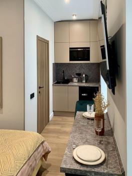 санузел - совмещённый, мебель - кухня, хранение одежды, спальные места, кондиционер, холодильник, плита, микроволновка, стиральная машина, посудомоечная машина.