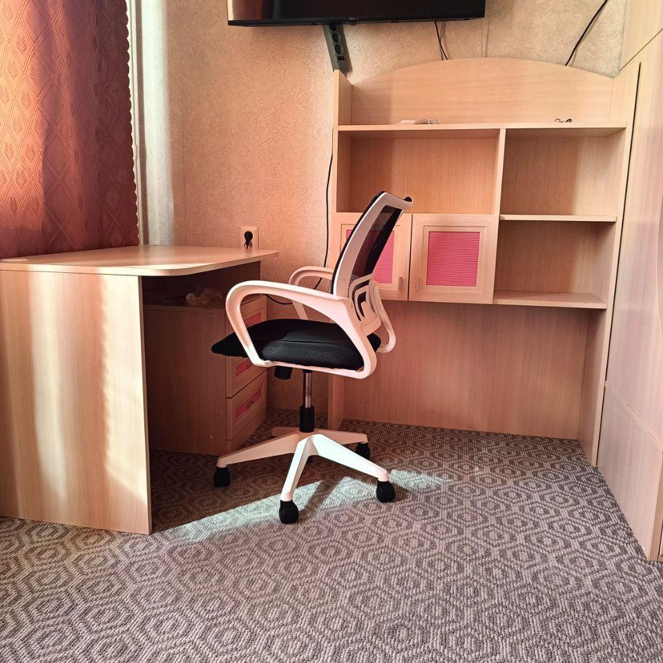В комнате-кухне есть диван, который при необходимости можно разложить в дополнительное двуспальное место. Есть удобный туалетный столик с подсветкой и вращающимся регулируемым стулом – очень удобное место для ухода за собой.