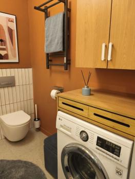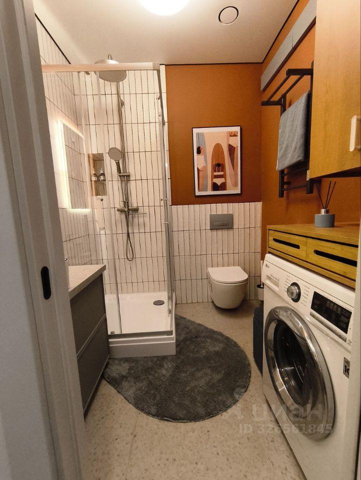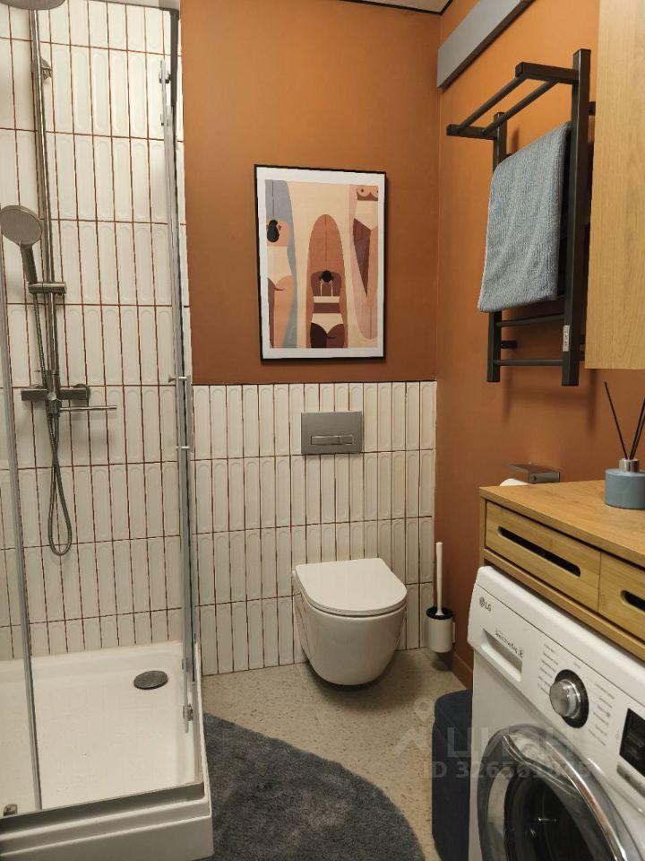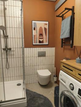 В санузле установлена душевая система с тропическим душем, стиральная машина, полотенцесушитель.