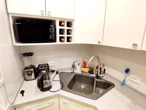Из техники в квартире есть: стиральная машина, варочная индукционная плита, духовой шкаф, посудомоечная машина, микроволновая печь, холодильник, измельчитель бытовых отходов.